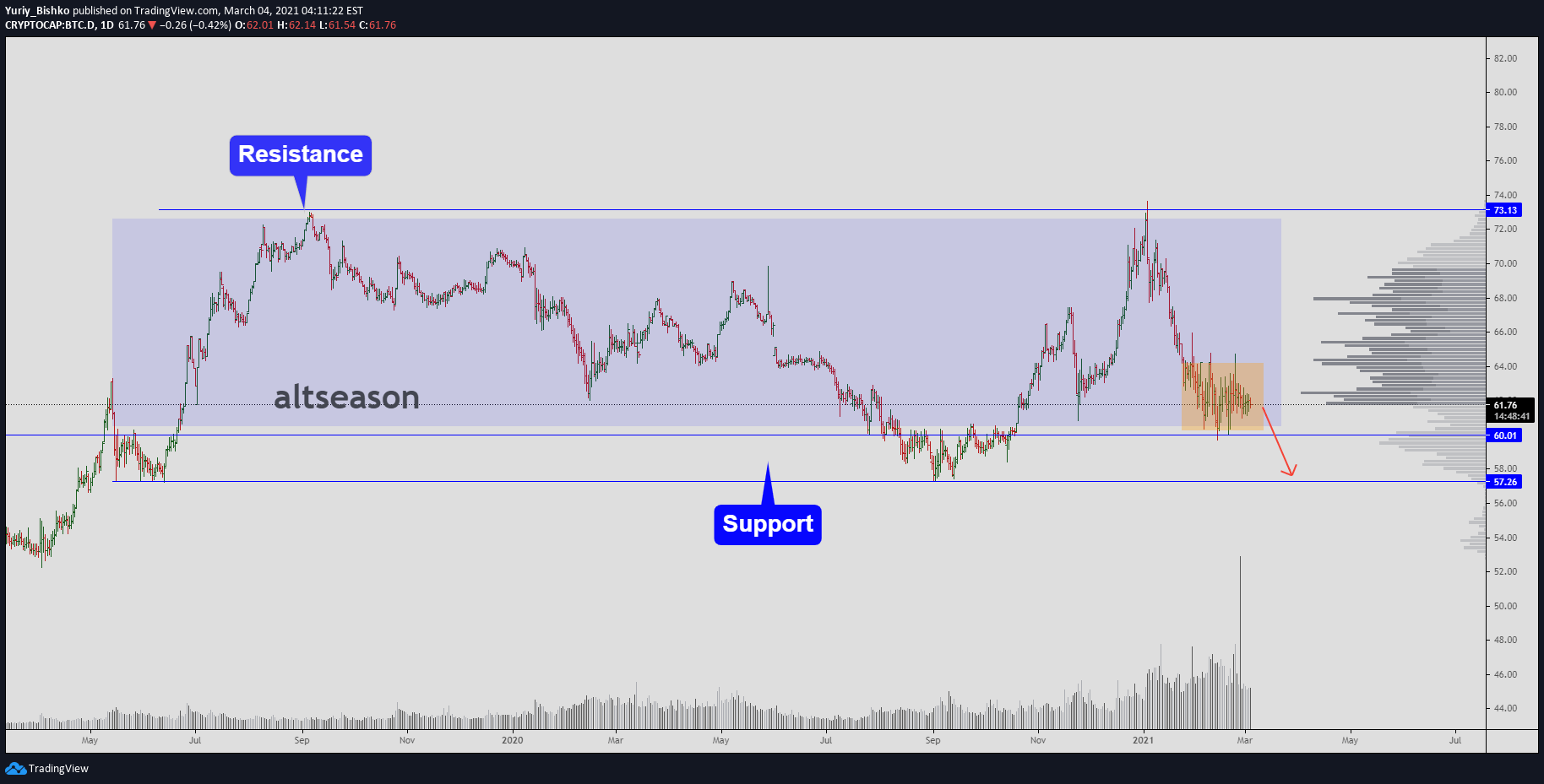 Guarda il grafico live di market cap btc dominance, % (calculated by tradingview) per seguire le ultime variazioni di prezzo. Bitcoin dominance is simply an indicator that demonstrates the percentage of bitcoin's market cap relative to the entire market cap. En son fiyat değişikliklerini izlemek için canlı market cap btc dominance, % (calculated by tradingview) grafiğini görüntüleyin. Cryptocap:btc.d handelsideen, prognosen und marktnachrichten stehen ihnen ebenfalls zur verfügung. Consultez le graphique en direct market cap btc dominance, % (calculated by tradingview) pour suivre les dernières modifications de prix. 23.11.2021 · the above chart shows the total cryptocurrency market capitalization, excluding bitcoin. See the total crypto market cap, which is 0.87% lower than yesterday, defi coins market cap has decreased by 0.89%. Major cryptoassets by percentage of total market capitalization (bitcoin dominance chart) loading data. To many people in crypto this is a key bitcoin graph to understand the entire space. It is also a way to view the total alt coin market cap. Des idées de trading concernant cryptocap:btc.d, des prévisions et des informations sur le marché sont également à votre disposition. View live market cap btc dominance, % (calculated by tradingview) chart to track latest price changes. Avrai a disposizione anche idee di trading, analisi e notizie su cryptocap:btc.d.